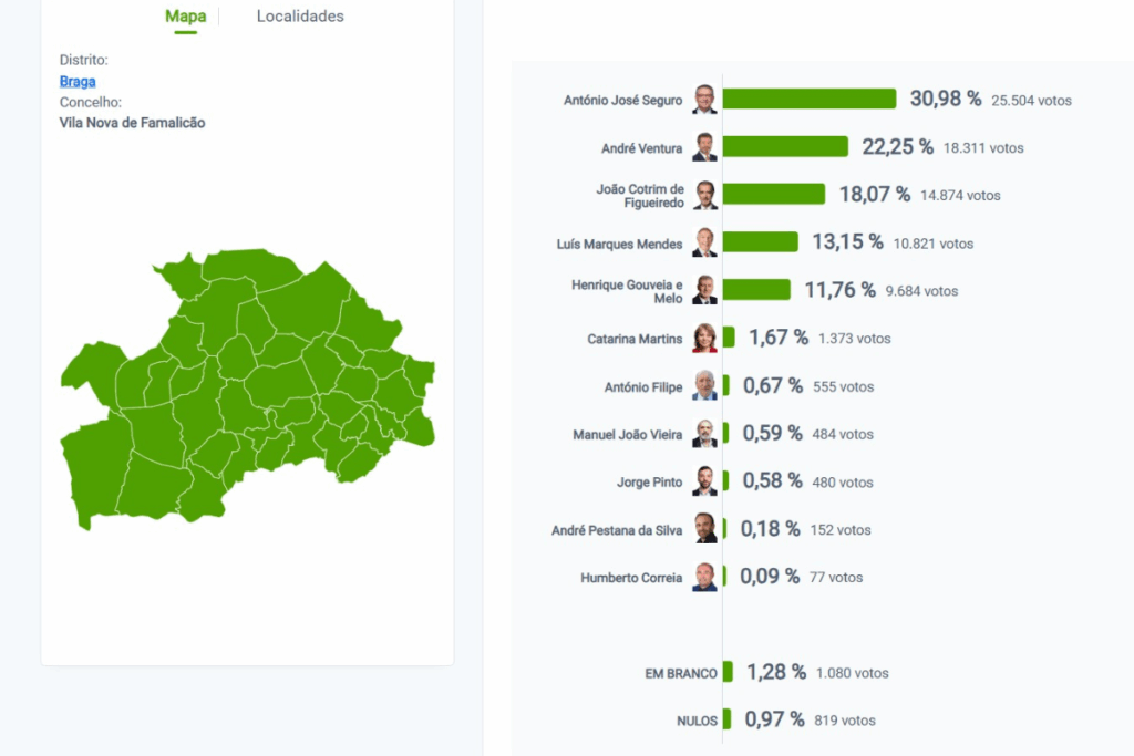 A segunda volta das eleições será disputada no dia 8 de fevereiro com André Ventura que em Vila Nova de Famalicão André Ventura obteve 22,25% dos votos.